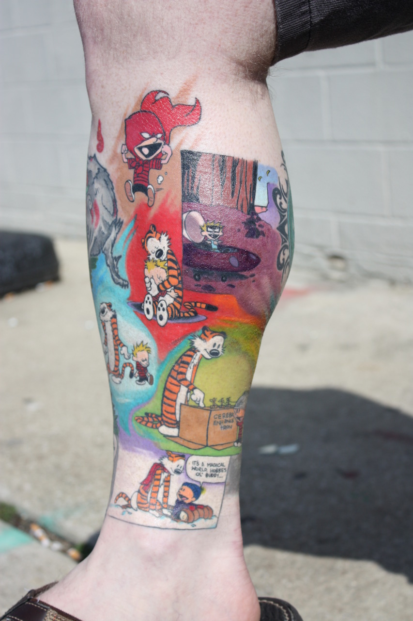 i couldn’t decide on which panel to get, so i settled on two. one of calvin and hobbes hugging (coincidentally the one in the center of the tattoo shown here) and one in which calvin and hobbes are looking at a crack in the sidewalk and contemplating the fleeting nature of life. to top it all off, i decided that i wanted to get them in a place that wouldn’t be obvious to the rest of the world. so, naturally, i decided on my upper thighs.